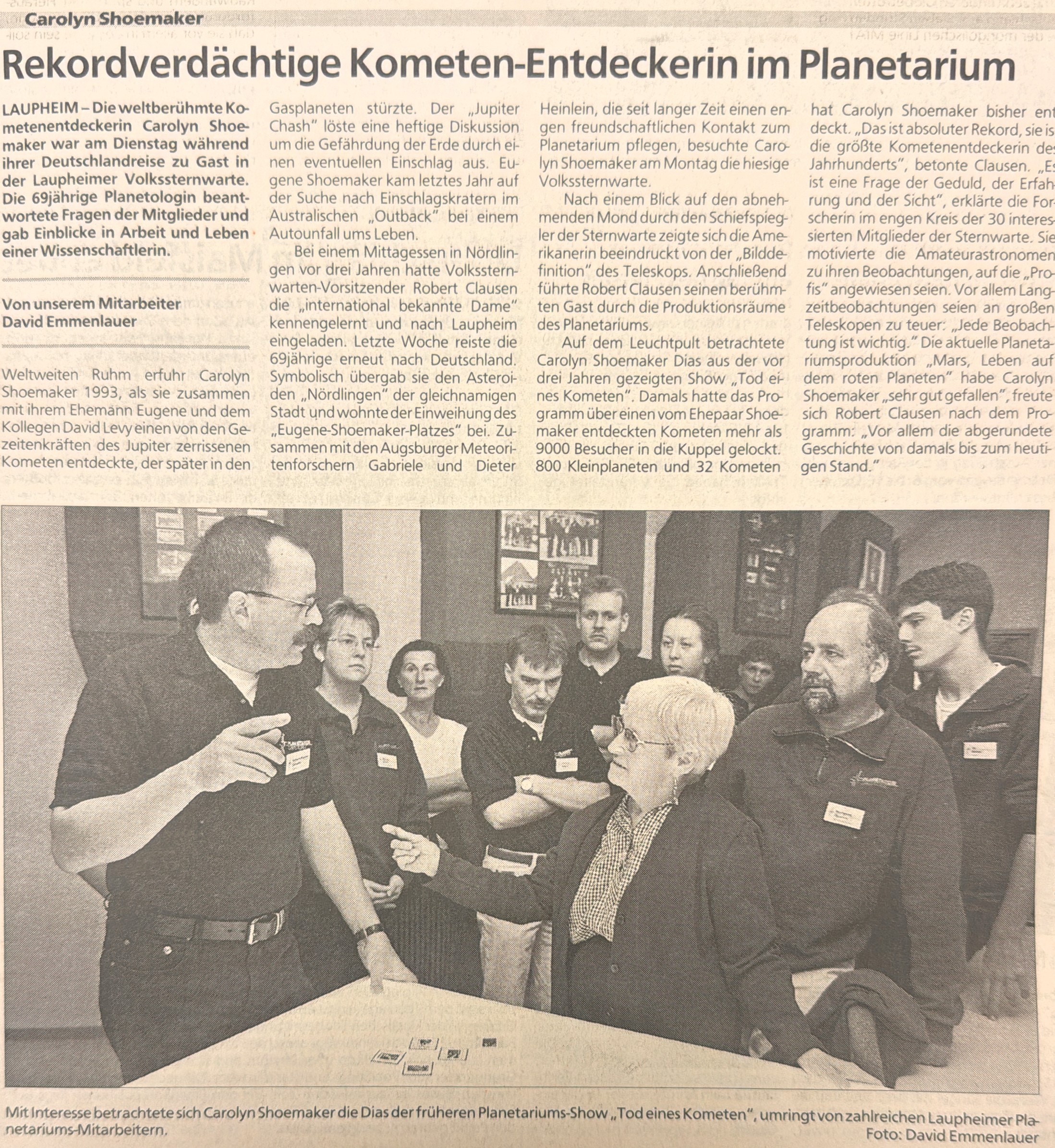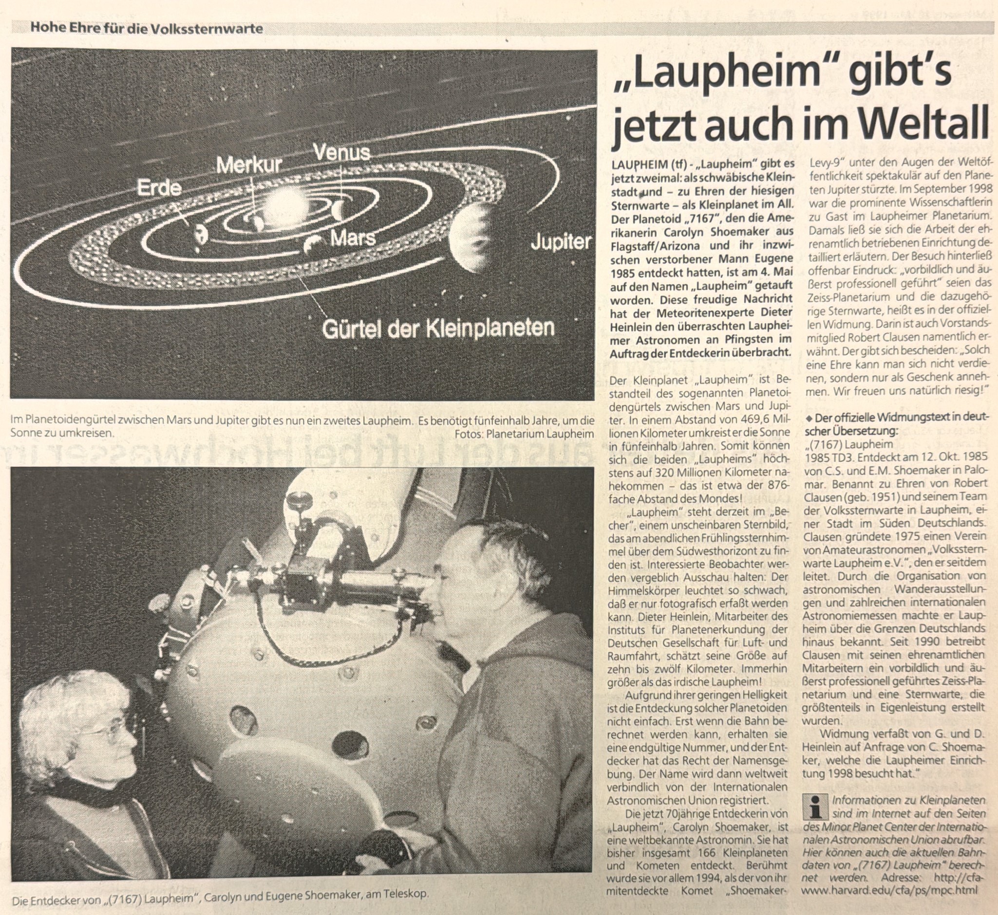 Im September 1998 besuchte Carolyn S. Shoemaker das Planetarium Laupheim persönlich. Sie war begeistert von der Professionalität und dem Engagement, mit dem das Carl-Zeiss-Planetarium von ehrenamtlichen Kräften geführt wird. Diese Begeisterung fand ihren Ausdruck in der folgenden Widmung:
