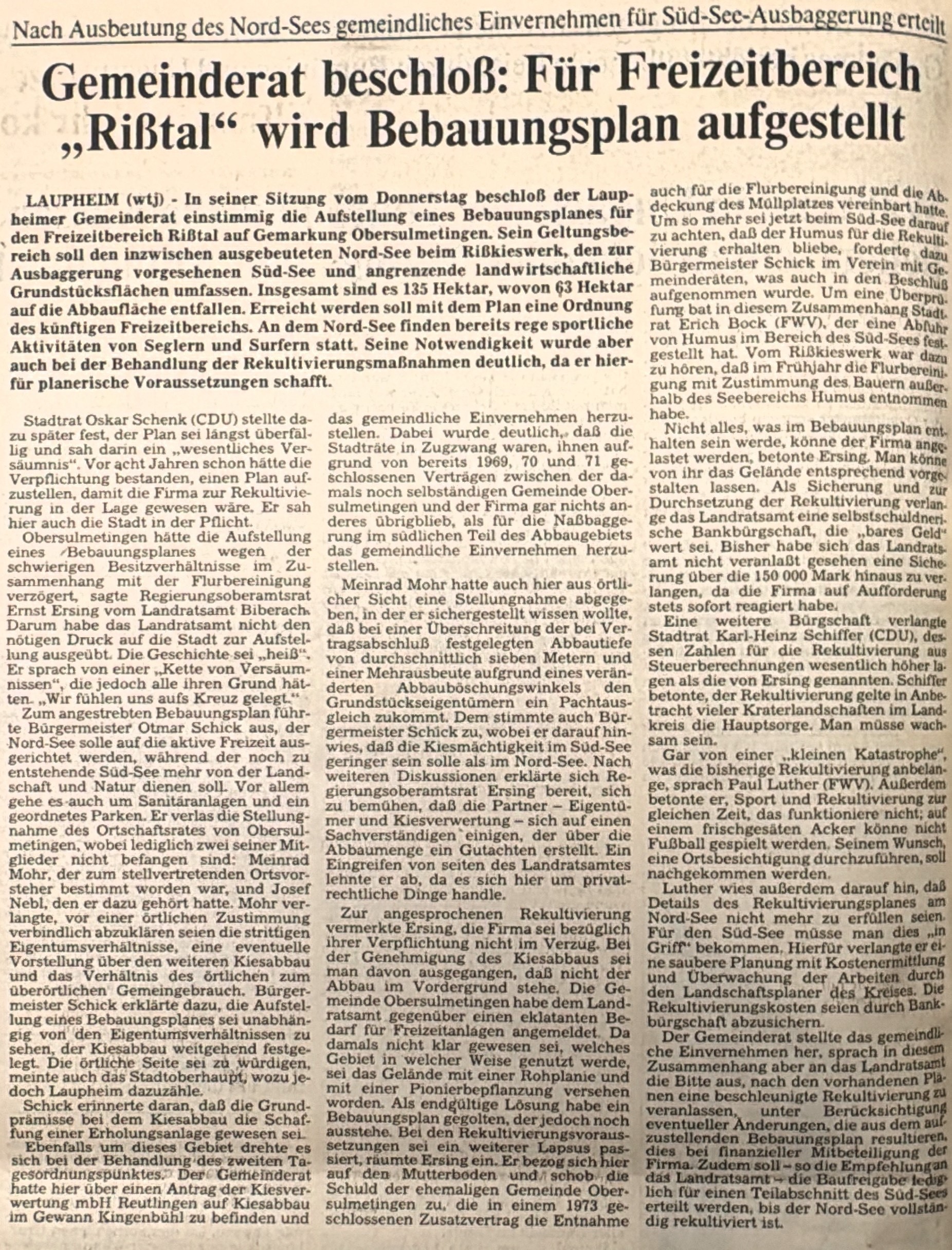 Artikel aus der Schwäbischen Zeitung vom 15. Mai 1982 über dem Bebauungsplan des „Freizeitbereichs Rißtal“