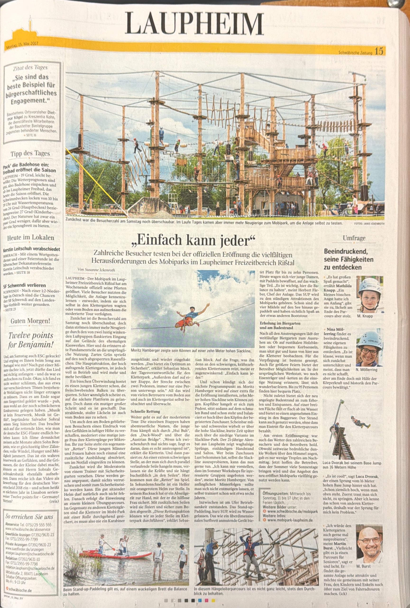 Schwäbische Zeitung vom 15.05.2017 über die Eröffnung des Mobiparks auf dem Gelände des ehemaligen Kieswerks